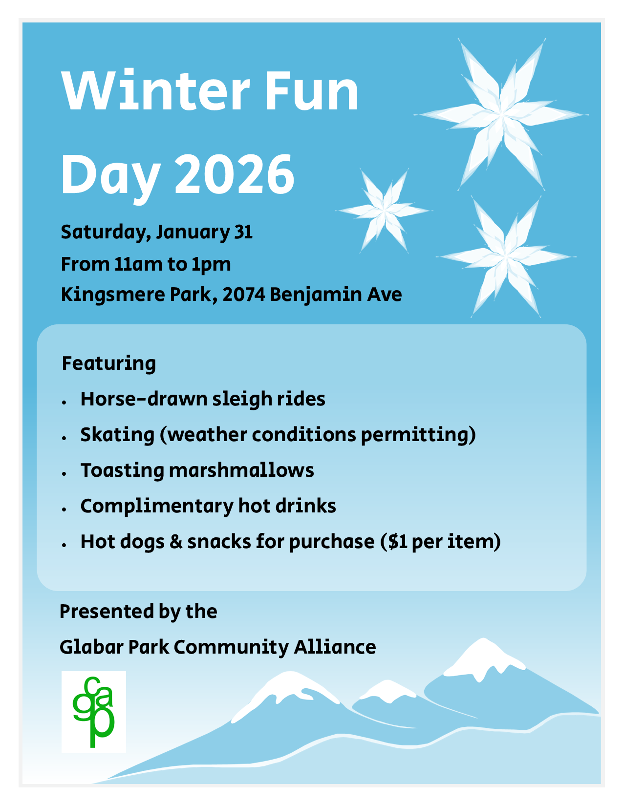 The Glabar Park Community Alliance will also host a volunteer gathering on Sunday, November 30 at 4:30PM at Colonnade Pizza (2140 Carling Ave – Fairlawn Centre), before the season starts. It’ll be a chance for everyone to meet, go over responsibilities, and enjoy some pizza! RSVP at kingsmererink@gmail.com so we can plan for numbers.